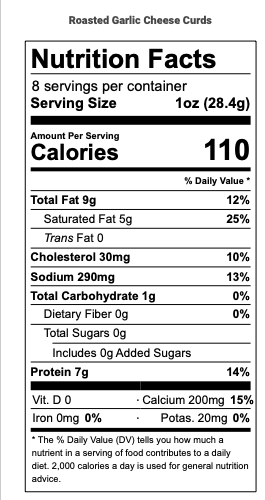 CHEDDAR CHEESE CURDS [PASTEURIZED MILK, SALT, CHEESE CULTURES, ENZYMES ] SEASONING [Salt, Onion, Spices and Herbs (Including Paprika), Roasted Garlic, Annatto, Citric Acid, Dill Weed Oil, and Extractives of Coriander.]